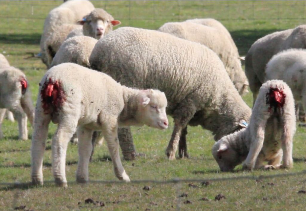El mulesing es una de las prácticas más crueles de la industria lanera, especialmente en Australia. Se trata de cortar grandes trozos de piel alrededor del ano de corderos jóvenes, sin anestesia, para evitar infecciones causadas por moscas. Esta herida queda en carne viva durante semanas, causando dolor extremo y estrés prolongado.